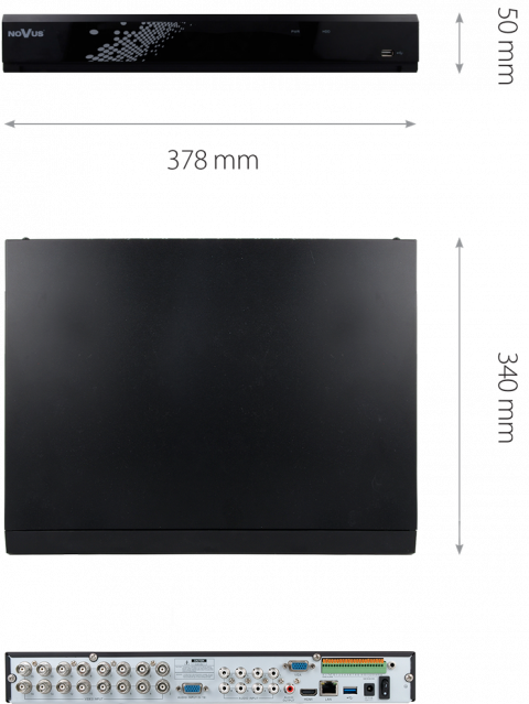 Der Rekorder ist für die Arbeit mit AHD-Kameras und IP-Kameras der Novus 4000-Serie bestimmt und erreicht mit ihnen die beste Funktionalität. Bei der Arbeit mit IP-Kameras hängen die Funktionen für intelligente Bildanalyse, Dualstream-Modus, PTZ-Steuerung, Bewegungserkennung und Alarmeingänge/-ausgänge von der Funktionalität der IP-Kamera und den Fähigkeiten des Kommunikationsprotokolls ab. Detaillierte Daten zur Kamerakompatibilität mit Rekordern und kompatiblen Festplatten finden Sie in den Kompatibilitätstabellen, die auf der Registerkarte DOWNLOADABLE FILES verfügbar sind.