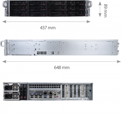 | Stromversorgung | Eingebautes 2 x redundantes Netzteil 230VAC Eingang mit je 960W Leistung |