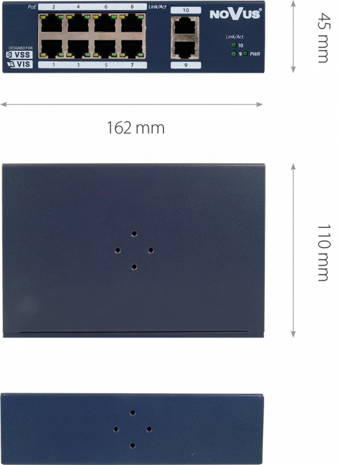 | Ports | PoE+-Anschlüsse: 8 x 10Mb/s / 100Mb/s (zur gleichen Zeit die Anzahl der verfügbaren Ports auf der PoE + Modus, wird durch die Kapazität der Stromversorgung begrenzt), Ports RJ-45 UPLINK 1Gb/s: 2 |