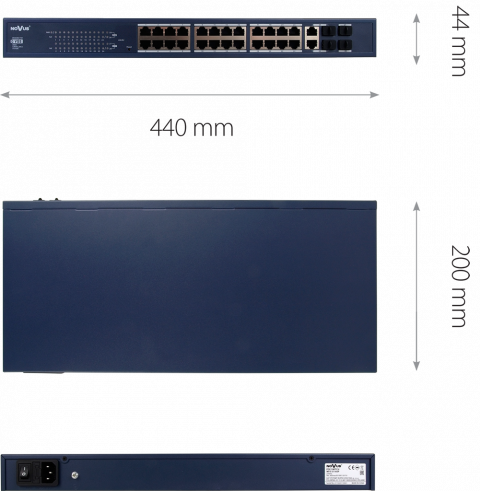 | Ports | PoE+-Anschlüsse: 24 x 10Mb/s / 100Mb/s (zur gleichen Zeit die Anzahl der verfügbaren Ports auf der PoE + Modus, wird durch die Kapazität der Stromversorgung begrenzt),UPLINK SFP port 1Gb/s x2 ,Uplink Combo x 2 :SFP(1Gb/s) + RJ45(1Gb/s) |